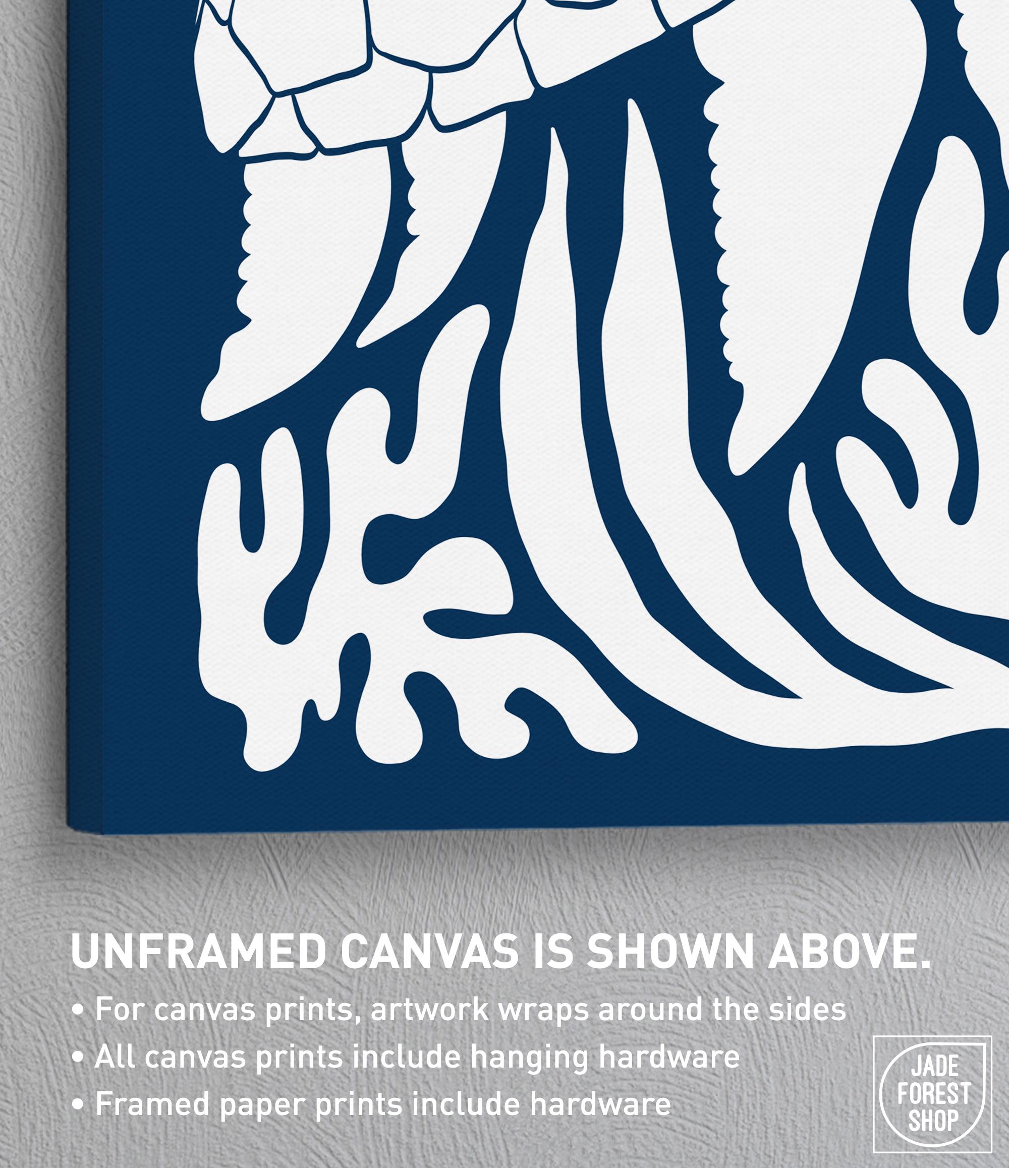 CANVAS — Printed on smooth, clay-coated canvas, and gallery-wrapped over a 3/4" deep wood frame. Can be displayed framed or unframed, with hanging hardware included on back for both.